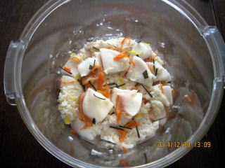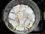 | 12/29 | ・甘酒の準備 乾燥600gをほぐした中にぬるま湯100ccを加え 炊きたてのご飯を2合分と60℃のお湯400ccを混ぜ合わせる。55〜60℃を確認後保温ジャーに入れ麹菌にがんばってもらいました。9、5時間で切り上げ、さけ、さば、ぶり用に分けます。 |