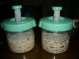 | 12/28 | 軽く締めて、外の寒い倉庫に置きます。これまでは甘酒の液が1カップほどあがってきたので取り除いて飲んでいたのですが、今年はのぞくほどたまっていません。麹600gに湯400ccは適量でした。取り出した上澄み液は全部で150ccほどでした。煮沸して発酵を止めて冷蔵庫に保管、煮物用の甘み付けに用いました。 |