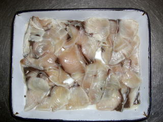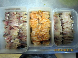 ・ぶり、鮭、さばの塩漬け ぶり、さけの棒状の刺身に、塩を振り冷蔵庫に12時間寝かせます。さっと水洗い後、水分をとり3ミリぐらいの厚さで切ります。 そして米酢に6時間浸けます。この酢のおかげで刺身が完成時に身崩れが少なくなり、深い味わいになります。右の写真は左からさけ、さば、ぶりですが酢で締めると白っぽくなり鮮やかさが消えますが、本漬けすると本来の色が戻ってきます。 |