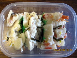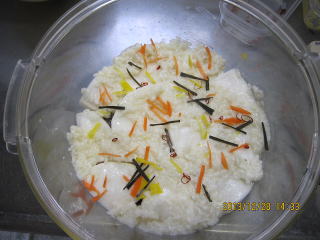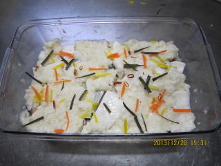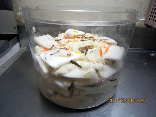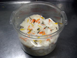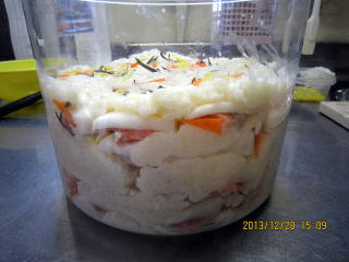 | 12/29 | ・本漬け 容器の中に甘酒をしき、かぶを隙間がないように並べます。また甘酒をしき、こんぶ、にんじん、ゆず、赤唐辛子輪切りをちらしていきます.。ぶり |