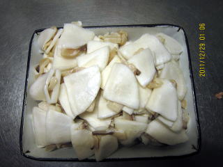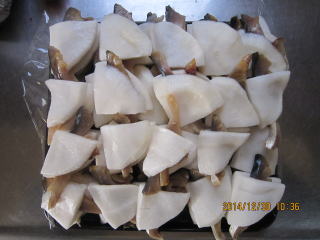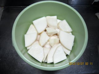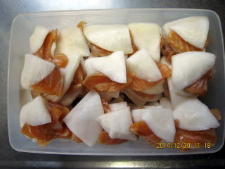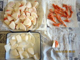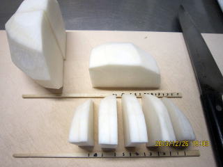 | 12/26 | ・かぶらの準備 かぶは、皮を厚めにむき、縦4つに切る。さらに割り箸をおいて5等分に切り込みを入れ、またその間に切り込みを入れる。この後5つに切り分ける。 |