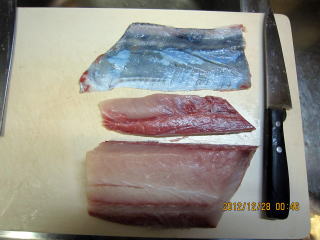 | 左からサーモン、さば、ぶりの塩漬けです | 左から さば、サーモン、ぶりの黒酢しめです。 | ||