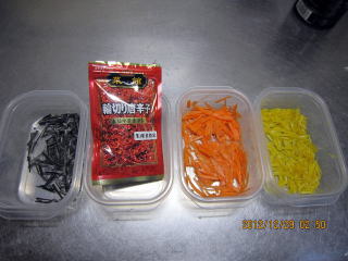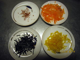 | 12/30(火) | ・彩り、香りづけ野菜準備(A) ニンジン、昆布、ゆずの皮を千切りにします。輪切り唐辛子は既製品です。 |