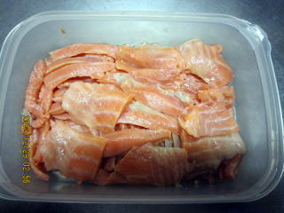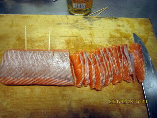 | 12/27 | ・ぶり、鮭、さばの塩漬け ぶり、さけの棒状の刺身に、塩を振り冷蔵庫に12時間寝かせます。さっと水洗い後、水分をとり3ミリぐらいの厚さで切ります。 上段:ぶりは皮付きなので安い、皮をはぎます。血合い の箇所が脂がのっておいしそうなので時々切ってはおつまみします。右は塩を振った状態。 下段左:トラウトサーモンにもトロサーモン部分があるので醤油をつけて一部いただきま〜す。写真は塩を振った状態です。 |