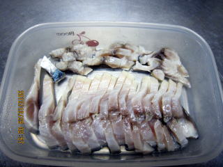 ・酢でしめる 6時間の予定が12時間、体も酢もつかり(れ)すぎてしまったが結果はいかに。さけ57切れとさば25切れ。 |