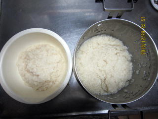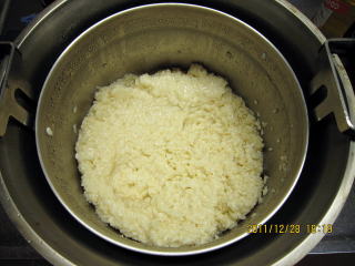 ☆2011年のかぶらずし用甘酒つくりでは湯の量を通常の甘酒づくりの1/2(2袋で300cc)とするとよいと思っていたが、あまり に少なく発酵するか心配で150cc追加した。甘酒できると水分がいっぱいとなっていた。2011年は300gにしよう。