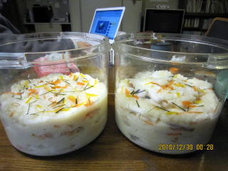 | 12/27 | ・甘酒の準備 乾燥麹400gをほぐした中に炊きたてのご飯を1合分(茶碗2杯)と60℃のお湯200ccを混ぜ合わせる。55〜60℃を確認後保温ジャーに入れ5〜8時間蒸らすと糖化する。糖化が完了すると温度が下がる。 |