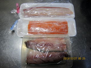 | 12/27 | ・魚の塩漬け 上からぶり、トラウトサーモン、さばです塩を振り冷蔵庫に1日寝かせます。この後サバ1/4はしめさばにしていただきました。 |