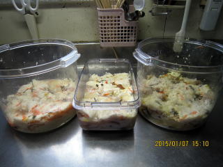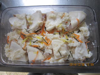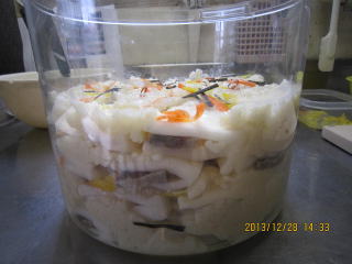| 12/28 | 容器の中に甘酒をしき、かぶを隙間がないように並べます。また甘酒をしき、こんぶ、にんじん、ゆず、赤唐辛子輪切りをちらしていきます。左から、さけ、さば、ぶりです。 | ![]() |
