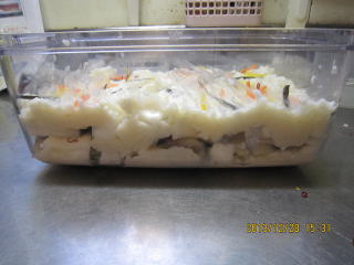 | 12/28 | ・材料はさみと本漬け さばの切り身をかぶにはさんで、その後3等分しておいた甘酒、さばをはさんだかぶら、(A)の材料を交互に重ねていきます。 |