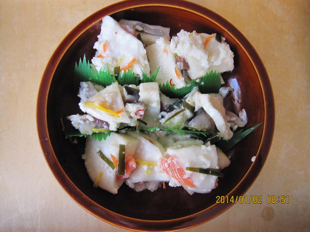 | 1/1 | ・蔵出し 大きいかぶらずしは、切って、切り口を見せるとお正月料理にふさわしくきれいです。元旦に家用に出しますが子供たちは敬遠します。 さばが酢に浸けた後にしめさばとして試食すると生臭かったのですが、蔵出し後はそれはみじんのかけらもありません。。食感がぶりとさけは柔らかく似ていますが、さばは身が締まっていてこちらの方がとりこになりそうです。 2日以降は実家、親戚、知人へと旅立ちます。 |