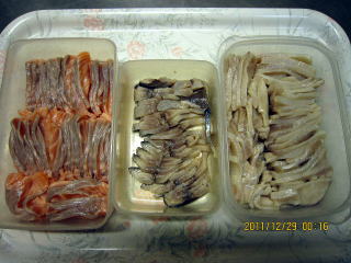 | 12/27 | ・ぶり、鮭の塩漬け ぶり、さけの棒状の刺身に、塩を振り冷蔵庫に1日寝かせます。これまでは当日6時間塩漬けていたのですが、甘酒の準備といっしょに準備しました。 28日は3ミリぐらいの厚さで切り、酢であらう。今回は15分ほど浸しました。この方がなれても刺身のくずれが少ないようです。 |