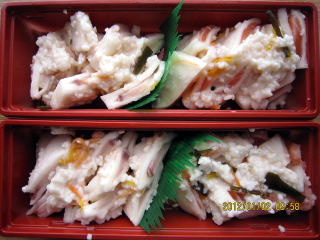 | 1/2 | ・蔵出し 右は兄弟やおばなどの親戚に届けます。 左は化粧用に重箱に詰めてみました。 やはりお正月の色です。味の方はぶりはすっかりなじんでいますが、さばは酢がしみこんだ分、締まりが強いような食感です。もう2日すればベストコンデションでしょう。さけはその中間といった具合でしょうか。塩加減は私好み申し分なし。各容器、さけとぶりは6〜7切れ、サバは3切れです。かぶらずし特使よ。いってらっしゃい。 |