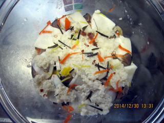 | 12/30(火) | ・本漬け ぶりです。刺し身が四角なのでカブにきれいに納まります。(53切れ) ブリをはさんだカブを一段敷いたら甘酒を敷き、(A)の材料を散らします。そしてまたカブを重ねて同様に進めます。 |