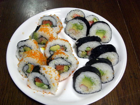 | 8 | 海苔と酢飯をひっくり返すのをわすれると巻き寿司になります。料理家ケンタロウさんの快食レシピにサーモンアボガド巻き(右)の作り方が新聞に載っていました。今回2本は裏返しを忘れたため普通巻きになってしまいました。やはりカリフォルニアロール(左)は派手でいいですね。 食べ方は、わさびとしょうゆが私は好きですがマヨネーズもあいそうです。 (写真は1.5人分) |