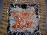 | 3 | <サーモン巻き> 裏巻きはこれが2回目でなかなかむつかしい。ラップが小さいためやりにくい。@海苔の上にラップを敷き酢飯を0.5センチぐらいの厚みで広げる。上端の部分は巻き終わりに酢飯がはみ出ないように1p残す。Aラップ台はそのままで海苔と酢飯をひっくり返す。Bアボガド、サーモン、きゅうり、わさびを手前に置きます。 |