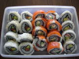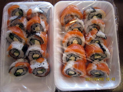 中央のスモークサーモン巻きがフィラデルフィアロール、両側がカリフォルニアロールです。(2009年8月15日)