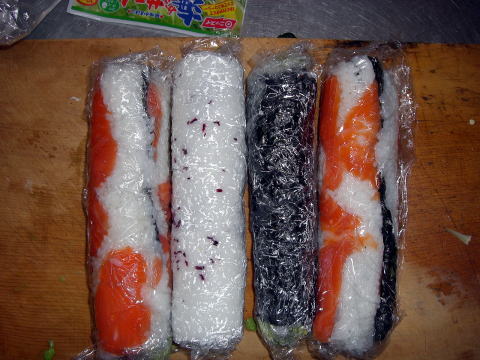 | @酢飯は1本150gです。海苔裏巻きを忘れると巻き寿司となります。(右から2番目) | A1本を4分の1に切り分け一人分にしました。大きすぎて食べにくいという輩もいました。切るには簡単なのにな〜。 |