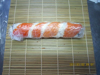 | 2 | <スモークサーモンのせ> カリフォルニアロールなら白ごまやとびっこを小さじ1杯まんべんなくまくところであるが、ここではスモークサーモンを敷きつめる。そして大きめのラップをのせ、具材がくっつく程度に押さえた後、ひっくり返す。 |
