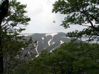 | @ 林道から見る金糞岳(中央左奥の方)に続く稜線 | A 登山道にはブナの木があり気分も上々。しかしうるしの木が登山道にはみ出し、要注意です。 |