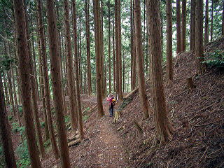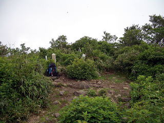 すぐに今度は右足脛でチクリ、やばいズボンの上からつまむと、むにゅっとした感触です。ぎゅっと布地でつまんで裾をめくるとやはり蛭です。休憩は切り上げ歩きました。さて登山道は植林帯の中も下草がきちんと刈られ快適です。山頂までの1.5時間の登りはランニング・ハイに似たとても爽快な登りでした。