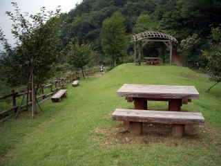 | @ 神仏温泉から走り出します。黄色看板は明日のジ ョギング大会案内です。 | A 東海自然歩道の一環としてH12に整備された ふれ あいの森です。 |