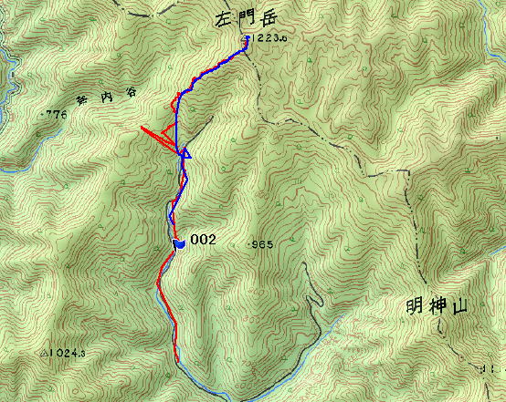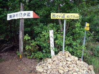 左門岳登頂はうれしかったが、こんな簡単に650m分岐が見つけられてあっけなかった。6月にはこの分岐が見つけられなくて右往左往してやむなくリタイアしたが、今回はナビできっちり650mをポイント指示、足下にモノレール索道に左:左門岳、右:植林道の案内マジック書きをぴしゃりと見つけることができた。おかげで、前10mを植林道へ先行する登山者にも声をかけてやることができた。6月は草が多かったことも見落とした原因のひとつか