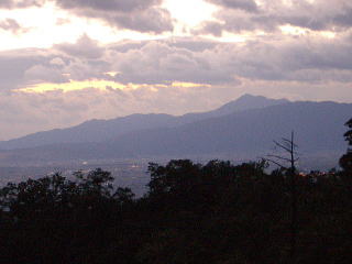 | B 夕日で赤っぽく見えるところですが。 | C 中腹の展望台より北方面、時雨れ始めています。 |
