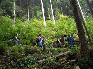 | B杉の植林帯の中を気持ちよく歩けます。 | Cさくら峠で蛭を取り除きました |