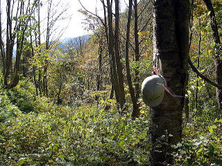 さて沢沿いの道は、難しくない。時々見失うが対岸を探せばたいていは出てくる。宝探しのようである。20分でヘルメット地点へ到着。ありがたや、ガイドブックに載るほどの有名になったヘルメットであるが、それと対照的にひびが入ってみょうにみすぼらしく見えた。ここからは右岸に渡ってから山腹を急登し1000mの尾根へ飛び出す。腰高くらいの藪の中の登山道をあがっていくと時々展望が開けて写真を撮った。汗を吹き拭きゆるやかな山頂へ。山頂からは樹間から平家岳、明神山を望むことができた。屏風山方面は切り開いてあった。続いて2パーティ5人が到着。にぎやかな山頂となった。帰り道は往きに見つけておいたキノコを採取した。この山は登山道が荒れているのでジョギングシューズでは捻挫しそうな山だなと考えながら下山した。ダムから見えていたあのあまり高くない山が左門岳であり、難しい山と決めてかかっていたので、あっけなく終わってしまった感が拭いきれない。けれども一つの思い出に残る登山ができたという満足感を味わえた。