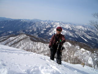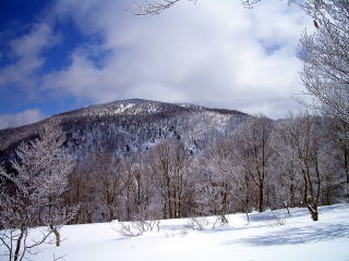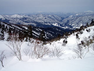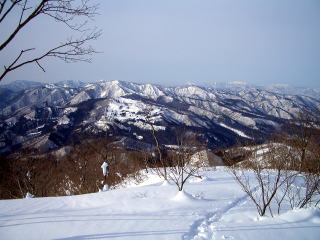 | B登ってきた尾根を背景に。新雪50センチ。 | Cやぶ山水後山。 |