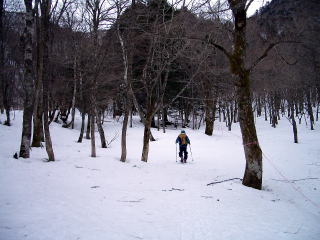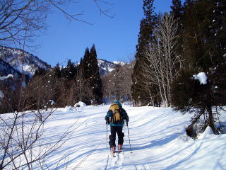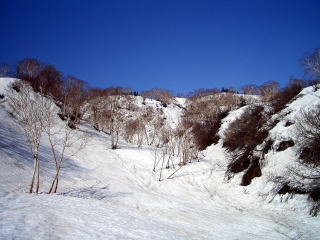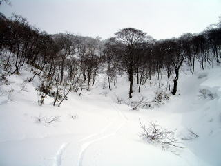 | L次の枝沢は埋まっていて良かった。 | Mスキー場にでてほっとする。 |