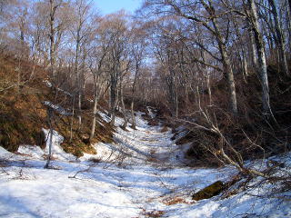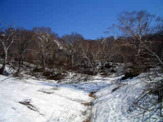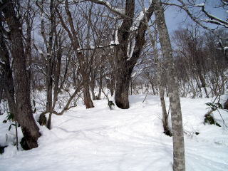 7:20 1400m このように雪がほそくなっていくといや〜な気分になってくる。雪がとぎれること3回、その後、沢のどん詰まりで小尾根を東に乗り越して東面台地に続く沢部に入る。2005年はこんな苦労はなかった。たぶんこの1週間で雪が切れたのであろう。 |