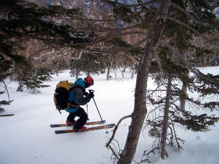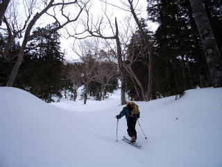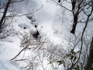 7:00 1295m スキーを着けたけど行く手を灌木と枝に阻まれ沢部をなんとか進む。雪が続くのか心配がよぎる。 |