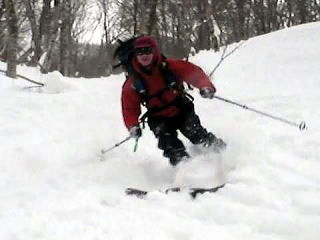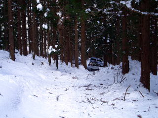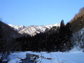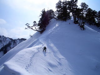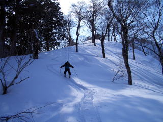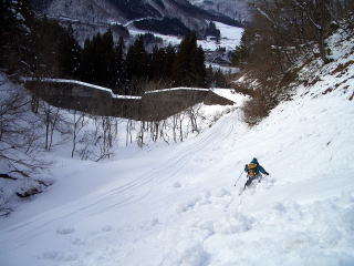 そしてもう一つの難所、ここは凍ったバーンの上に新雪が降った状態であり、注意が必要である。私は、転倒時胸を強打、1週間たった今も痛む。その後も尾根上を基本に滑ったが、もう少し早く沢に入り込めばもっと楽しめたと思う。養魚場の人に聞くと来年3月に河合村ICが開通とのことでした。