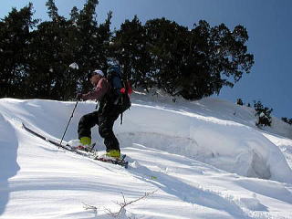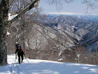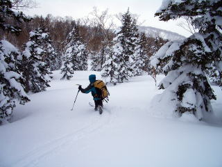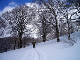 7:30のゴンドラを待って1340mのゲレンデトップから歩き始める。靴ラッセルでストックは60センチ沈む。しかし晴れの天候と行く先に水後山山頂が見えることはうれしい。1440mの尾根分岐から南西尾根に滑り込んでいこうと考えていた。ところが山頂近くに来ると南西斜面の水後川源流部は疎林であり、今日の行程の中ではスキーに最も適していそうである。休憩して決断する。2時間でゲレンデへもどることを考えて、1250mくらいまで下りトラバース気味に尾根に取り付き1300mの尾根に行き南の沢1150mまで下りゲレンデ1200mへもどる。標高差がそんなに大きくないため行けそうである。要はラッセルの程度であろう。