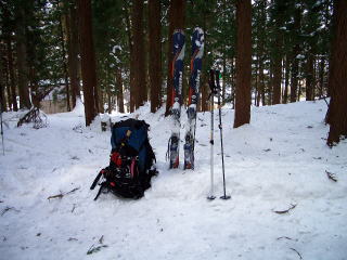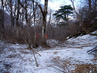 今回は2度目ということで、自転車はゆっくりスタートしたため、あまり疲れを感じずに登り口についた。これはさい先良いと思ったのに、いざ尾根に取り付きヤブをこいで、下り立つと雪が少ない。一昨年の同時期とは大きく異なり、歩くところも限られる。比較的雪がある沢部を先ほどの尾根を左手に見ながら、進んだ。灌木を手ではらいながら、どこまで行けば雪が覆ってくれるのかと不安になりながら1450m地点までに3度スキーを脱ぐことになる。そしてこの地点で沢が終了するので右手の小尾根をこすとこれから進む東面台地に続く沢部に入った。このあたりはGPSと赤布できちんと印を付けた。さあここからは雪があり、東面台地の始まりである。
