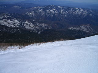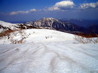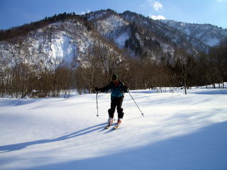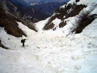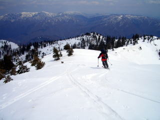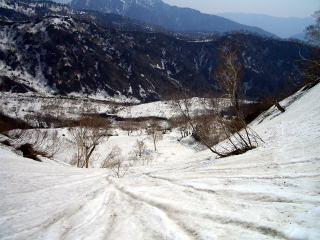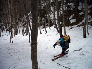 数日前の新雪は料金所付近ではすでに融けたようである。右岸はつながっており、そのまま右手の尾根に乗り上げる。快適に高度をあげる。1200mで樹林を抜けると絶景が広がり、疲れも吹き飛んでしまう。このコースの佳境でもある。赤頭山をトラバースするときには15センチほど新雪があった。まもなく山頂。先行者が一人いた。さてお楽しみ滑降である。白谷を自在に滑り、デブリランドに突入。しかし先行者がいやにゆっくりしている。聞くところによると滝が出て、やりにくい場面があるとのことで私たちに先に行ってほしいような雰囲気。彼は谷を詰めてあがってきている。山ごろ氏が先行してスキーをもって後ろ向きで手際よく降りる。わたしはこのところの緊張感から慎重になっているため、スキーを担ぎピッケルを出して後ろ向きで降りた。しかしながら別の後続単独スキーヤーは難なく、前向き壺足で、雪を蹴散らしながら降りるのを目の当たりにしてあっけにとられてしまった。