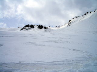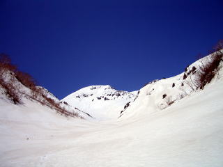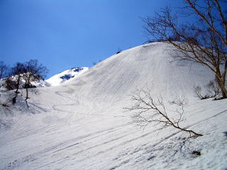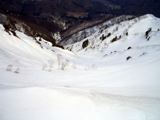 | G山頂からの滑降。パックスノーでした。 | H2600m付近は快適ザラメ雪です。左は岳谷源頭部です。 |