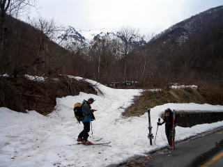 それぞれのキャパシティーで活動しているなぁとつくづく感じた。昨年5月14日に来たときでさえ滝は埋まっていたのに、今年は4月7日で滝出現とはいかに雪が少なかったか。根雪となるべく2月頃の降雪が少なかった影響がここにも来ているようだ。この難所を越えれば後は右岸を一直線、スキーを外す堰堤が一つあったが道路まで快適に滑り降りることができた。