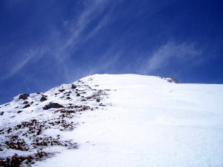 13:30 2702m 2500mの鞍部からは強風のため、アイゼンとピッケルの登頂です。感無量です。さい先よかったはずが7時間かかりました。おやじの体力低下か。 |