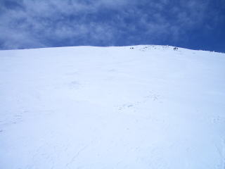 13:45 2500m 山頂から鞍部まで降りる。強風で表面の氷の破片が飛び散ってきます。数日前の降雪の影響と思われるスラフが急斜面では流れています。 |