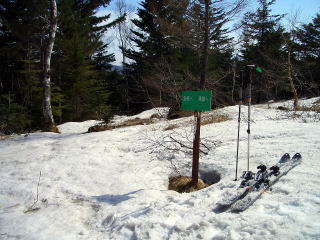 2500mからは樹林帯である。行きに付けた赤布を回収しながら滑るが赤布が見つからなくなった2017m付近でルートを外して枝尾根に入りかけたが、ナビで確認30mほど戻った。その後は順調に赤布を回収、1850mの尾根屈曲点は迷うことなくルートをとり下ることができた。飛騨山岳会の標識を見ると終盤、まもなくスキーを担いで感慨にふけりながら駐車地点まで歩いた。