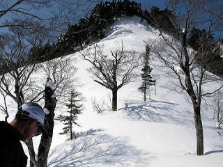 | H膝ラッセルの尾根への登りで振り返る水後山。 | I尾根から南斜面を標高差120m滑降する。 |