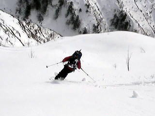 | Fノートラックの東面は深雪、湿雪滑降です。 | Gテレマークを決める山ごろさん。 |