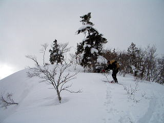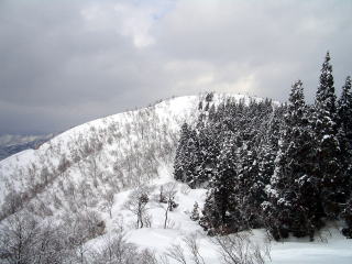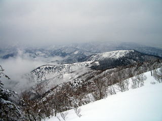 結局スキーアイゼンなしで丘のような山頂に着くことができた。東南に四つ岳、南方面に剣が峰、大日岳と臨むことができた。時折ガスが下からあがってくるので、早めに滑降に取りかかる。大崩山に向かってクラストとシュラカブを転倒しないようにこなしていく。2300mくらいからガスと小雪に見舞われ、おまけに濃い樹林帯であるので、お互い離れ過ぎないように声をかけ合って滑っていく。久手牧場上1700mくらいにくると下部が見渡せ自然ゲレンデとなる。林道があるため、段差や起伏が多い第3尾根であるが切り開きにより気持ちの良い滑降ができた。樹林帯の消化不良の滑りをここで解消できたようである。松本の皆さん、ラッセルありがとうございました。