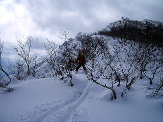 | @60センチほどの積雪か | Aやぶは濃く、急斜面はつらい。 |