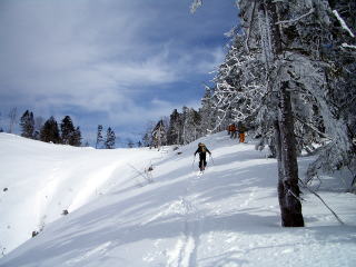 | J大崩山にむかって、イェ〜イと気合いです。 | K中間部は樹林帯、最後は牧場自然ゲレンデです。 |