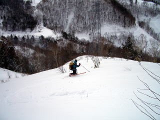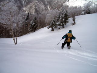 さて下りであるが前日のトレースもありJPから谷滑降にはいる。始めは湿雪パウダーで楽しむ。が後半は地図上でも予測されるようにゴルジュか連瀑帯かとうかがえるほどのV字谷である。フォールラインは狭すぎて滑降が困難なところもあり、横滑りも入れて降りていく。ようやく登りのトレースに出くわしてほっとする。一気に駐車場まで滑って本日終了。雪が多くあってブッシュが隠れていれば、登りのルートで滑った方が快適のようだ。