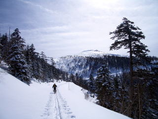 さて滑降にかかる。切り開き尾根を颯爽と行こうとするがカリカリバーンはおっかない。西に寄りすぎると谷まで滑落しそうである。1750mくらいからは、東面にノートラックのバーンが広がるようになり、山ごろさんと交互に滑り込む。15センチほどの深雪で時にカタツムリが落ちてくるがおおむねパウダー感覚が味わえる。そして斜面が荒れていないことが何よりの喜びであった。快感のうちに滑降終了となってしまったが、それにあわせて雲も出てきた。車横まで滑走して終了。朴の木の温泉でストレッチをして帰路につく。